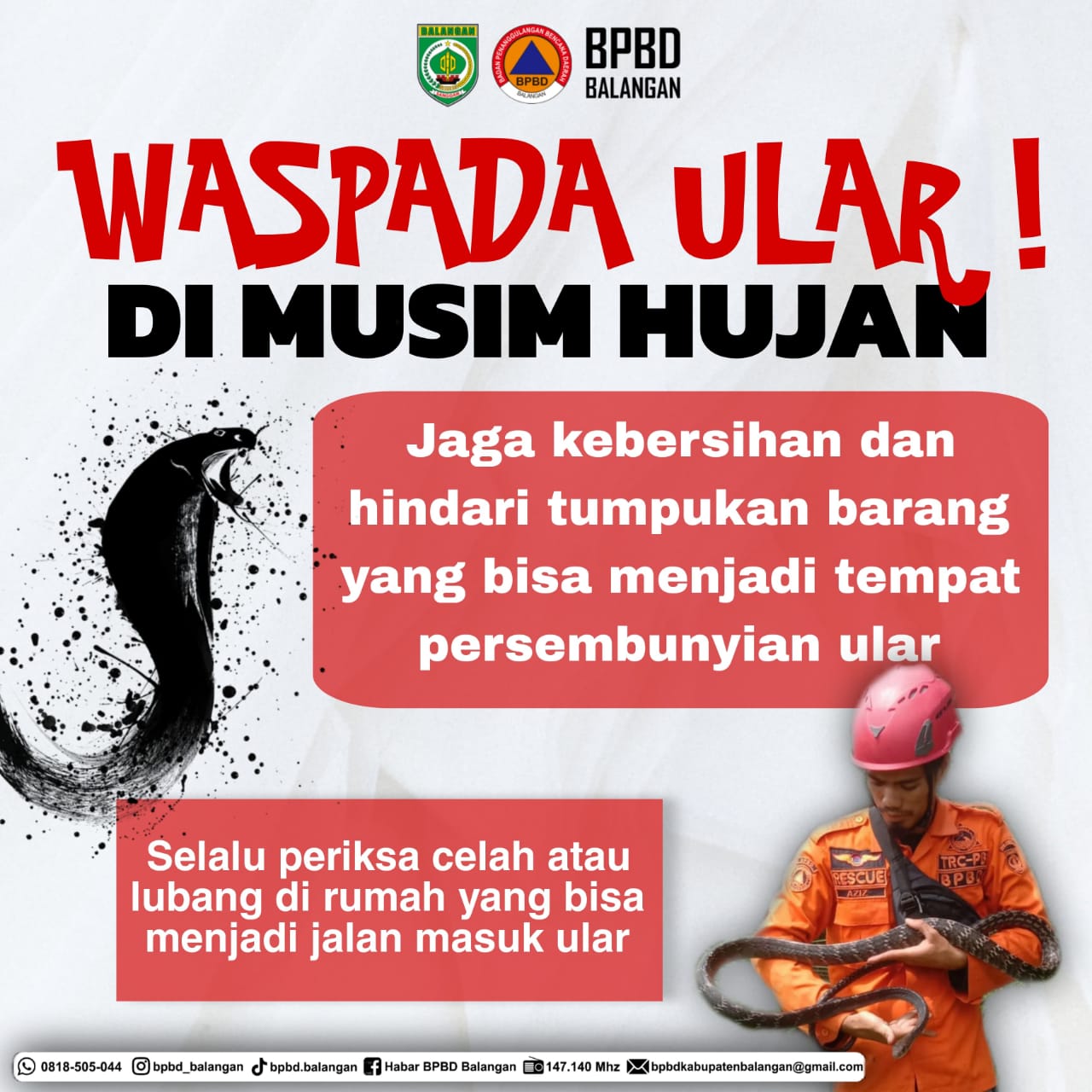 PARINGIN, balangantimes.com – Memasuki musim hujan, Badan Penanggulangan Bencana Daerah (BPBD) Balangan mengimbau masyarakat untuk meningkatkan kewaspadaan terhadap potensi ular masuk ke area permukiman. Curah hujan tinggi disebut membuat habitat ular tergenang air, sehingga reptil tersebut mencari tempat yang lebih hangat dan kering, termasuk ke dalam rumah warga.